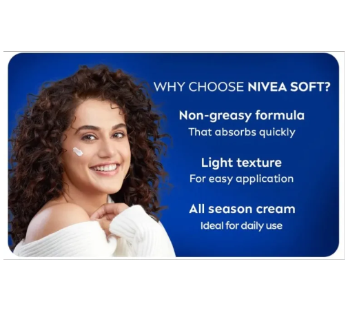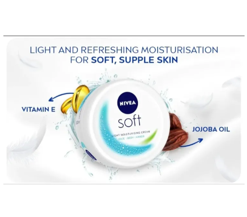 Discover the secret to irresistibly soft skin with Nivea Soft Jar Moisturising Cream (100ml). Indulge in a luxurious hydration experience that leaves your skin feeling velvety smooth. Order now at Dhonno.com and let the enchanting blend of Jojoba Oil and Vitamin E caress your skin with intense moisture. This lightweight formula absorbs quickly, providing instant nourishment without a greasy feel. Elevate your skincare routine and pamper yourself with the trusted goodness of Nivea. Customers at Dhonno.com are raving about the transformative results of this moisturizing cream. Don't miss out on the chance to impress with a radiant and hydrated complexion. Buy your jar of Nivea Soft Moisturising Cream today at Dhonno.com for a delightful online shopping experience and a skin that speaks volumes of care and indulgence.